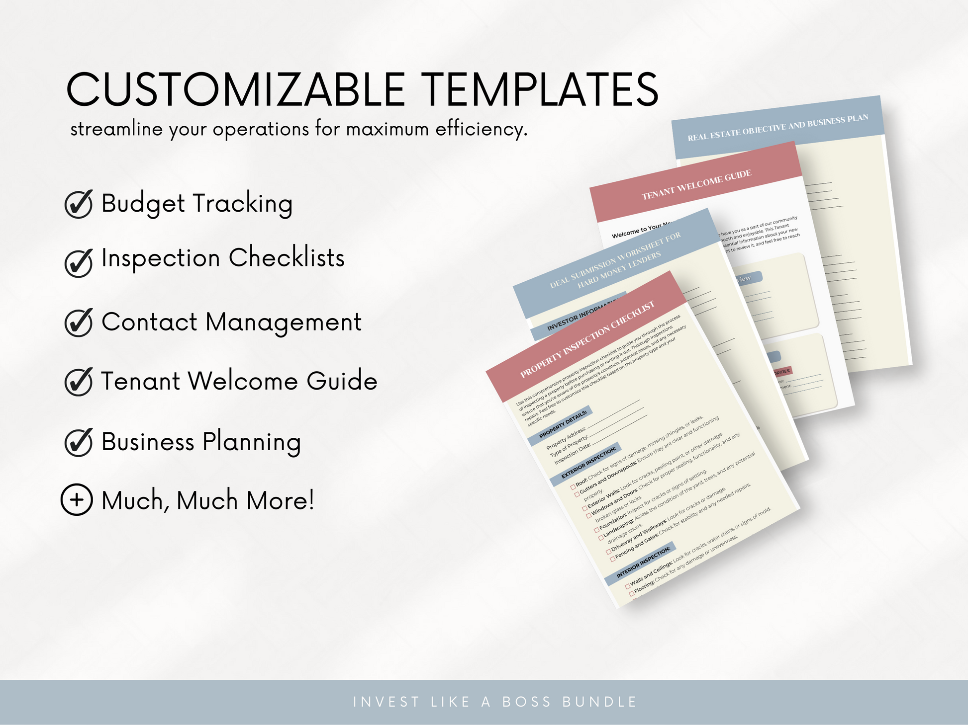 Welcome to the ultimate destination for aspiring real estate investors - introducing our "Invest Like a Boss" bundle. This comprehensive package is meticulously curated to equip you with the knowledge, tools, and templates necessary to navigate the dynamic world of real estate investment with confidence and finesse. Whether you're just dipping your toes into the market or ready to take your investment game to the next level, this bundle has everything you need to succeed.